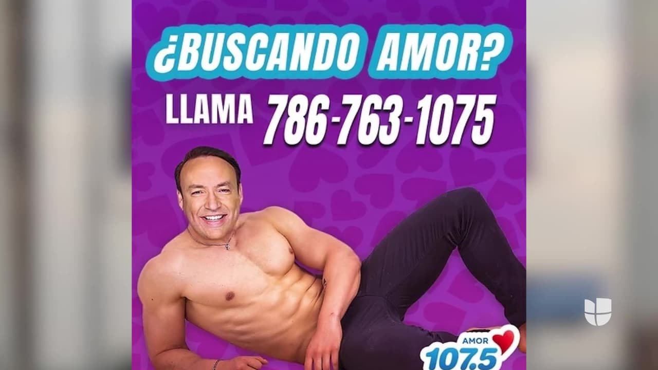 El conductor de El Desayuno de 107.5 Amor aparece musculoso y vistiendo solo unos pantalones negros, con una frase que refiere “¿Buscando Amor? Llama al 786-763-1075”.