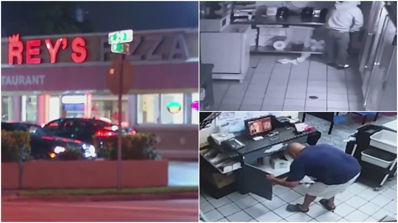 En video quedó captado el momento en el que un sujeto encapuchado rompe una ventana del restaurante Rey's Pizza, en Hialeah, en busca de dinero. Según el reporte, causó varios daños, obligando al establecimiento a cerrar sus puertas todo un día. Entretanto, en el restaurante Rey's Pizza de Coral Way, un individuo quebró una ventana con un pico para ingresar, pero al parecer no encontró dinero.