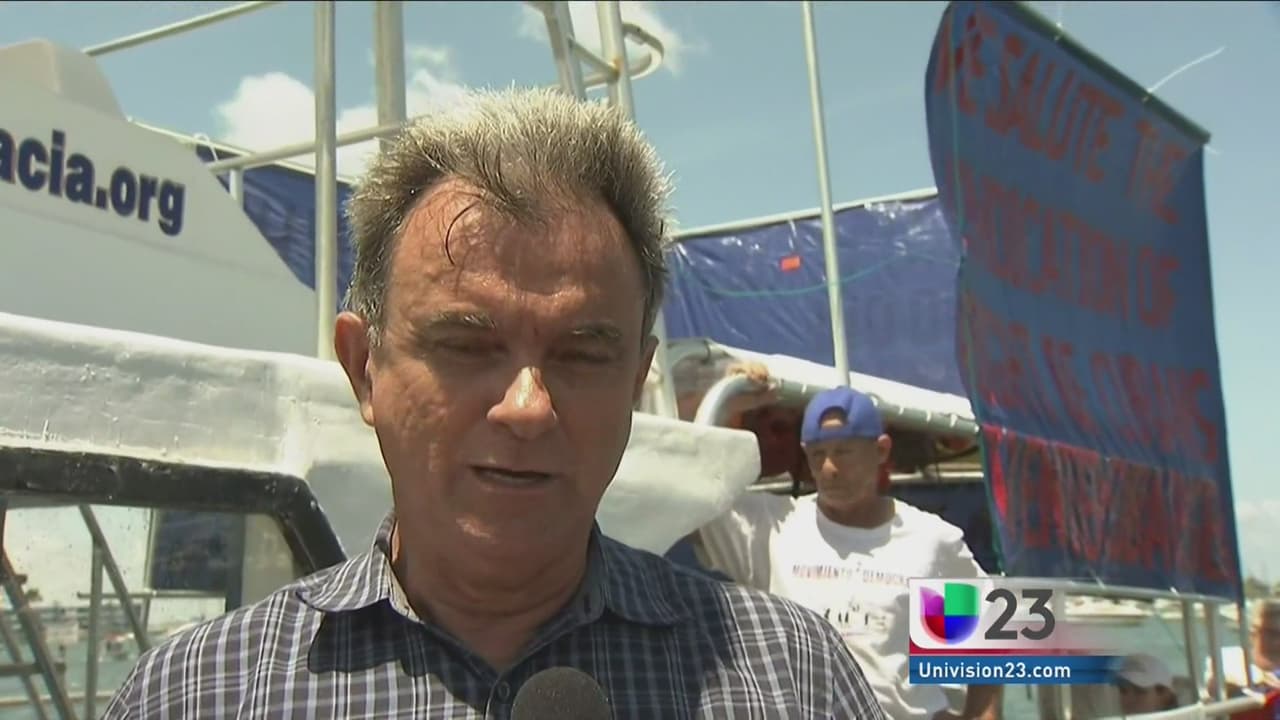Decenas de exiliados cubanos, entre ellos el activista Ramón Saúl Sánchez, celebraron la salida del crucero de Carnival.