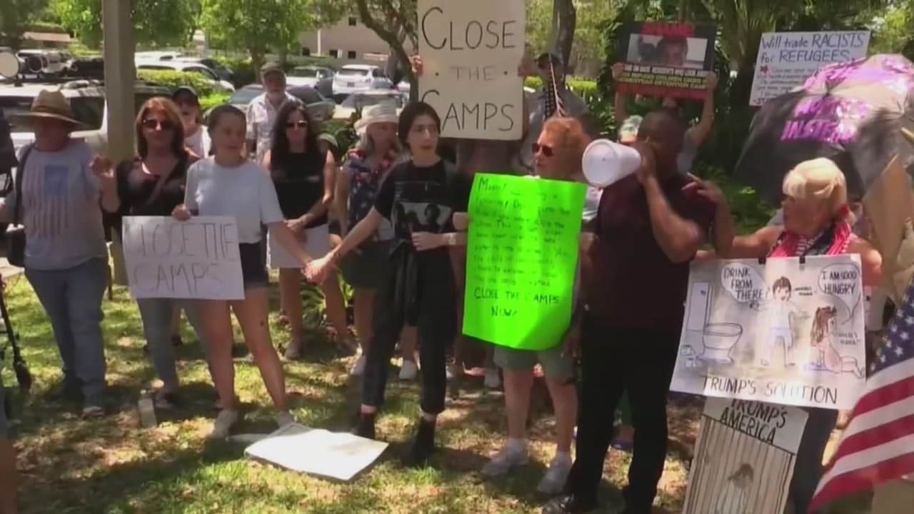 Con pancartas y gritos, los manifestantes le pidieron al político republicano acciones urgentes para que estos lugares a los que son llevados los migrantes sean clausurados. Aseguran que en dichos centros las personas no viven ni reciben un trato adecuado.