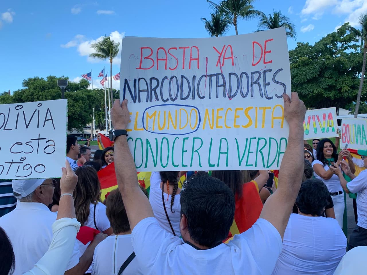 “Democracia si, dictadura no”, es la consigna que gritan los bolivianos, desde el Bayfront Park.