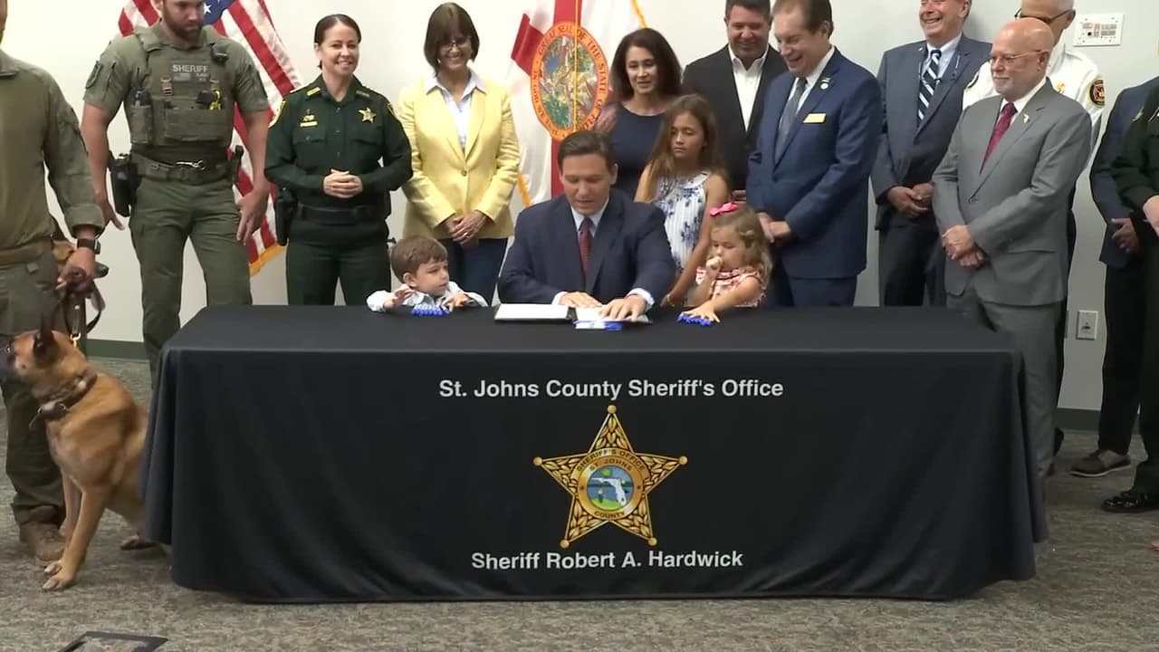 Video DeSantis firma ley para que perros policía reciban ayuda de rescatistas