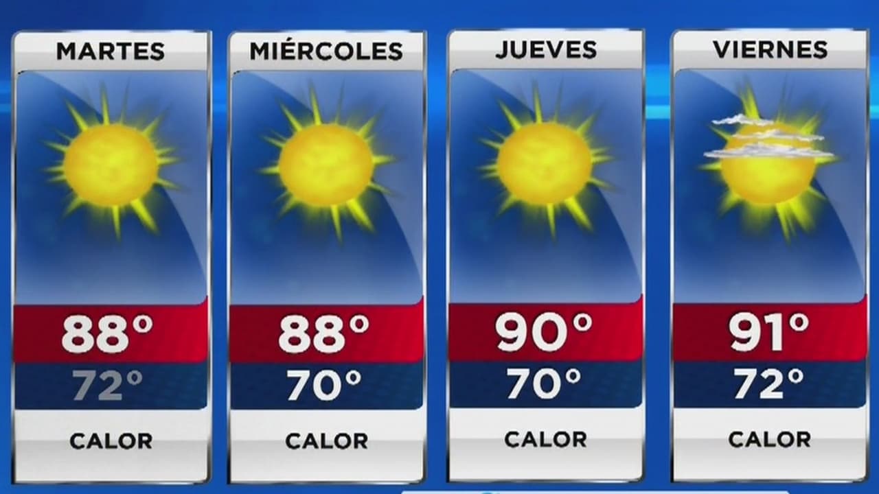 El día de hoy será de cielo totalmente despejado y soleado, con el calor en ascenso. La máxima temperatura llegará a los 88 grados, y la mínima de 72 grados. Para el resto de la semana se esperan condiciones muy similares.