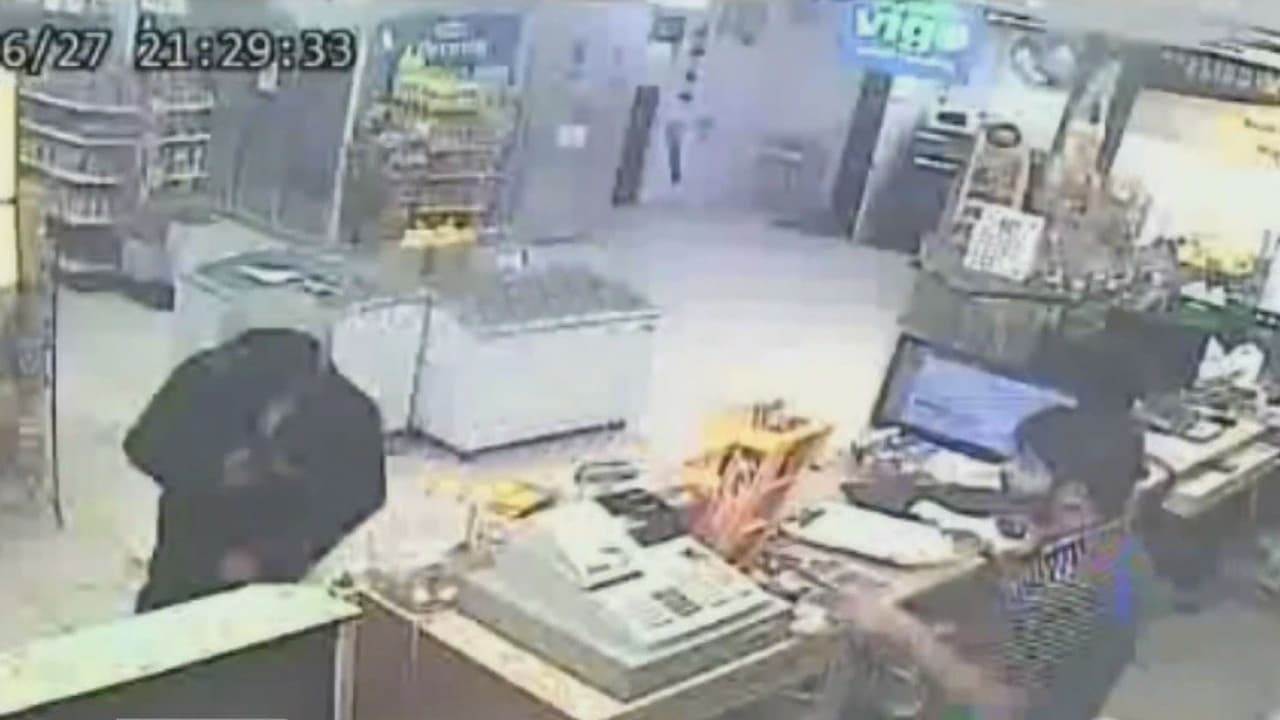 Un video captado por cámaras de seguridad muestra el momento en que los dos hombres ingresan a la tienda, apuntan con una pistola al empleado y huyen con una cantidad indeterminada de dinero. Autoridades buscan a los sospechosos.