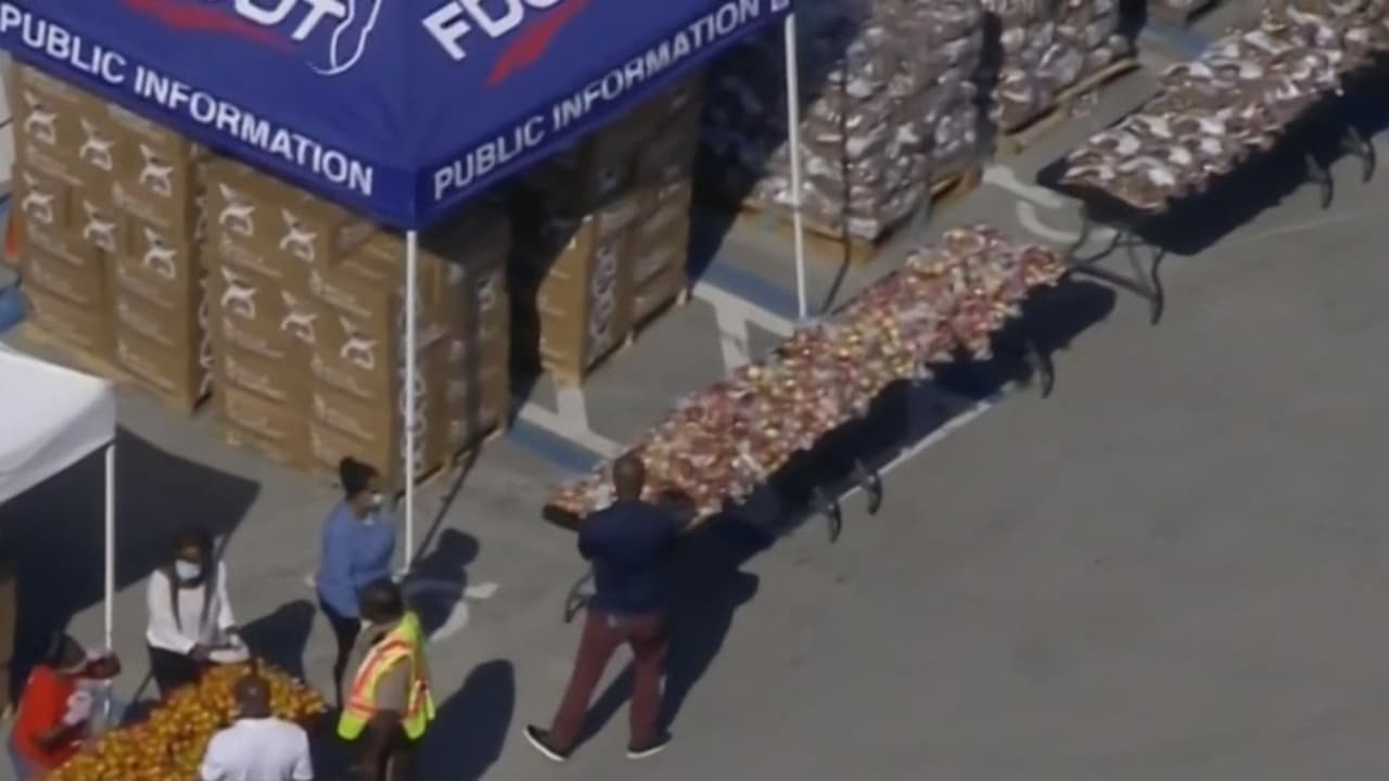 Cientos de personas han llegado este jueves hasta un centro de distribución tipo ‘drive thru’ ubicado en el lote este de Golden Glades Park & Ride para recibir productos como jugo de naranja, papas, pollos congelados y agua, entre otros. La organización sin fines de lucro tiene programadas otras fechas de entrega para los próximos días.