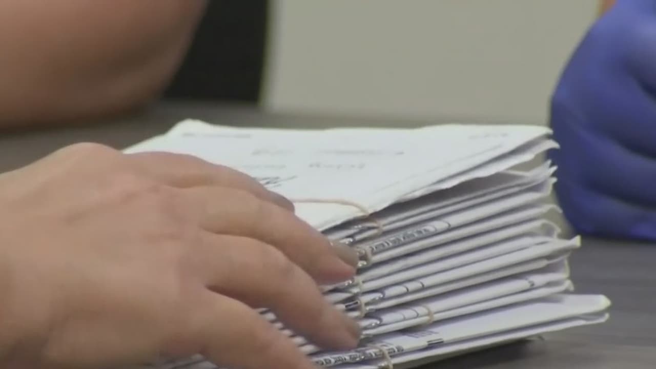 En el Departamento de Elecciones de Miami-Dade, un grupo de tres personas revisa las firmas de boletas que han sido utilizadas para votar por correo y las contrasta con las que hay en archivos para posteriormente poder aprobarlas. Entre los testigos que supervisan el proceso se encuentran abogados de las campañas de Donald Trump y Joe Biden.