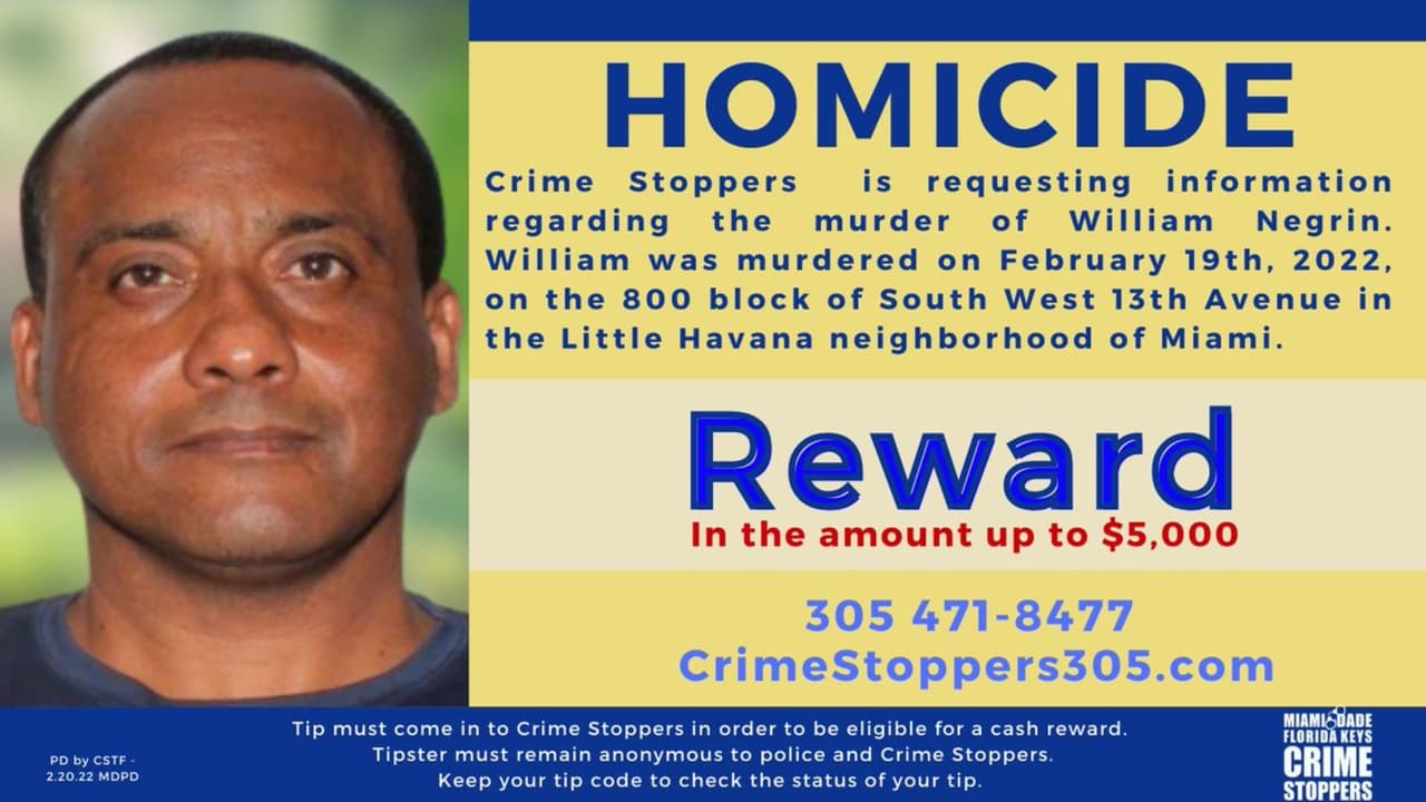 Las autoridades de Miami están solicitando la ayuda del público para identificar al responsable de la muerte de William Negrin, quien fue asesinado la madrugada del sábado 19 de febrero cerca de la intersección de la calle 8 y la avenida 13 del suroeste. La única pista que tienen hasta ahora es que se vio a un hombre encapuchado huyendo del lugar.