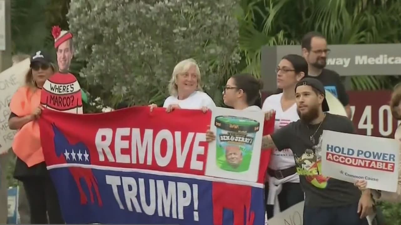 Varios detractores del mandatario se reunieron este jueves frente a las oficinas del senador republicano Marco Rubio para exigirle que tome una postura sobre el proceso contra el presidente, aprobado este miércoles por la Cámara de Representantes.