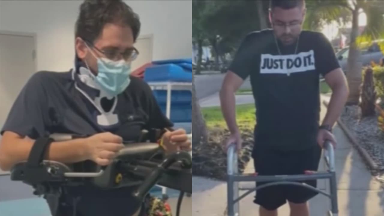 Juan Hernández, de 26 años, fue diagnosticado con una lesión en la médula espinal y graves daños en sus pulmones luego de sufrir un accidente. El hombre, quien tuvo que ser operado de emergencia en Fort Lauderdale, fue trasladado y tratado en un centro de rehabilitación y ahora, gracias a un programa intensivo, ha logrado recuperar su movilidad.