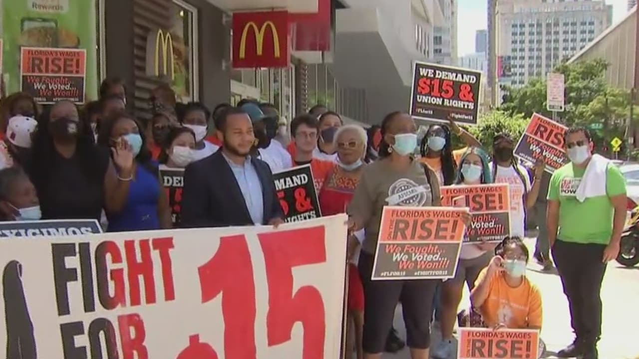 Este jueves se congregaron en una manifestación a las afueras de un McDonald's de Downtown Miami varias personas, entre empleados y miembros de varias organizaciones. Piden que haya un sueldo justo para quienes laboran en dichos negocios. Esto se da cuando entra en vigor en Florida un incremento salarial que pasa a $10 la hora.