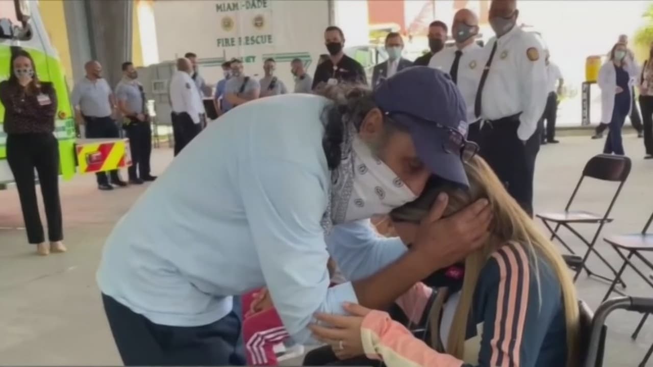 Hace tres meses Alba Alonso fue embestida por un conductor mientras estaba sacando del maletero una manta para su hijo. Tras el accidente, Jorge Rodríguez, quien es desamparado, se acercó a la escena y le puso un torniquete en la pierna mientras llegaba la ambulancia. "Solo siento agradecimiento", dice Alba. Este jueves el hombre recibió un reconocimiento en la sede de los bomberos de Miami-Dade.