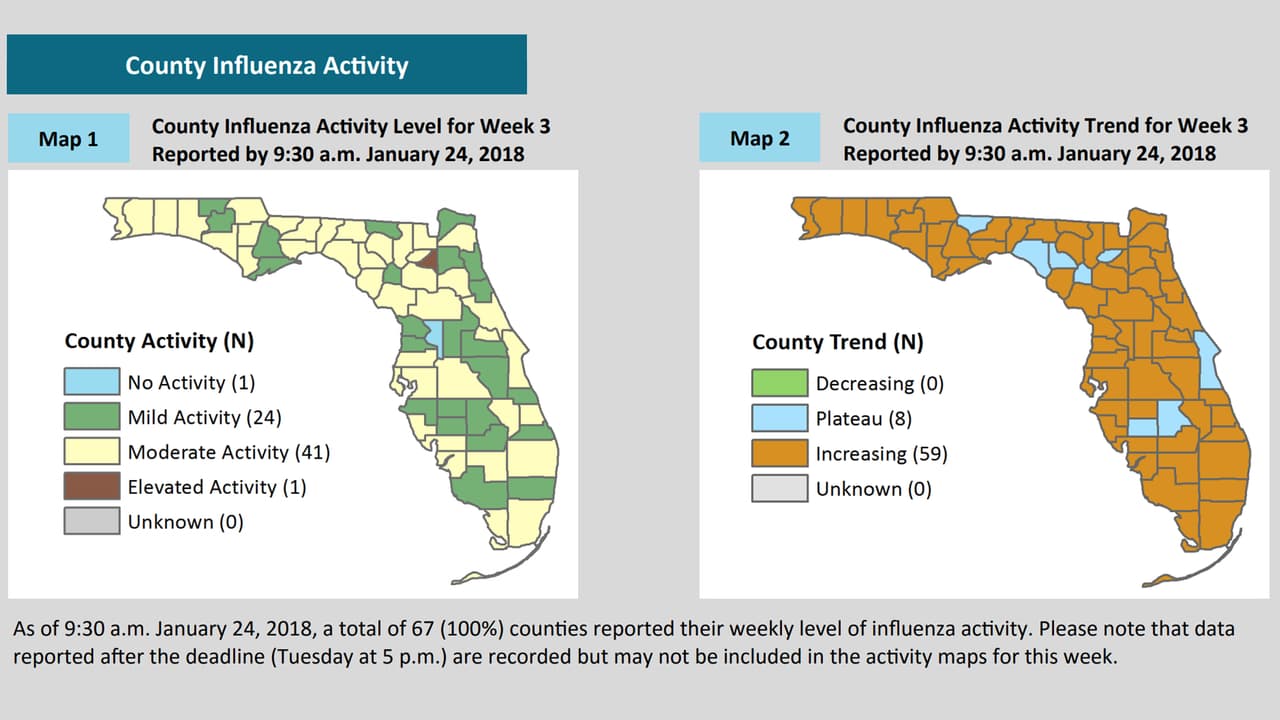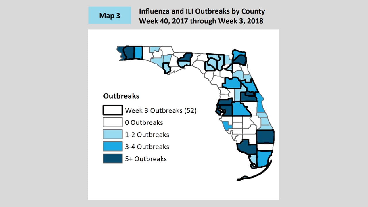 En 41 condados del estado de Florida la actividad de influenza es moderada. El condado de Bradford al norte del estado es el único que ha reportado una actividad elevada de casos. Los datos oficiales revelan que en 59 de 67 condados, los brotes han ido aumentando, y en 8 condados el número de casos se ha mantenido igual.
