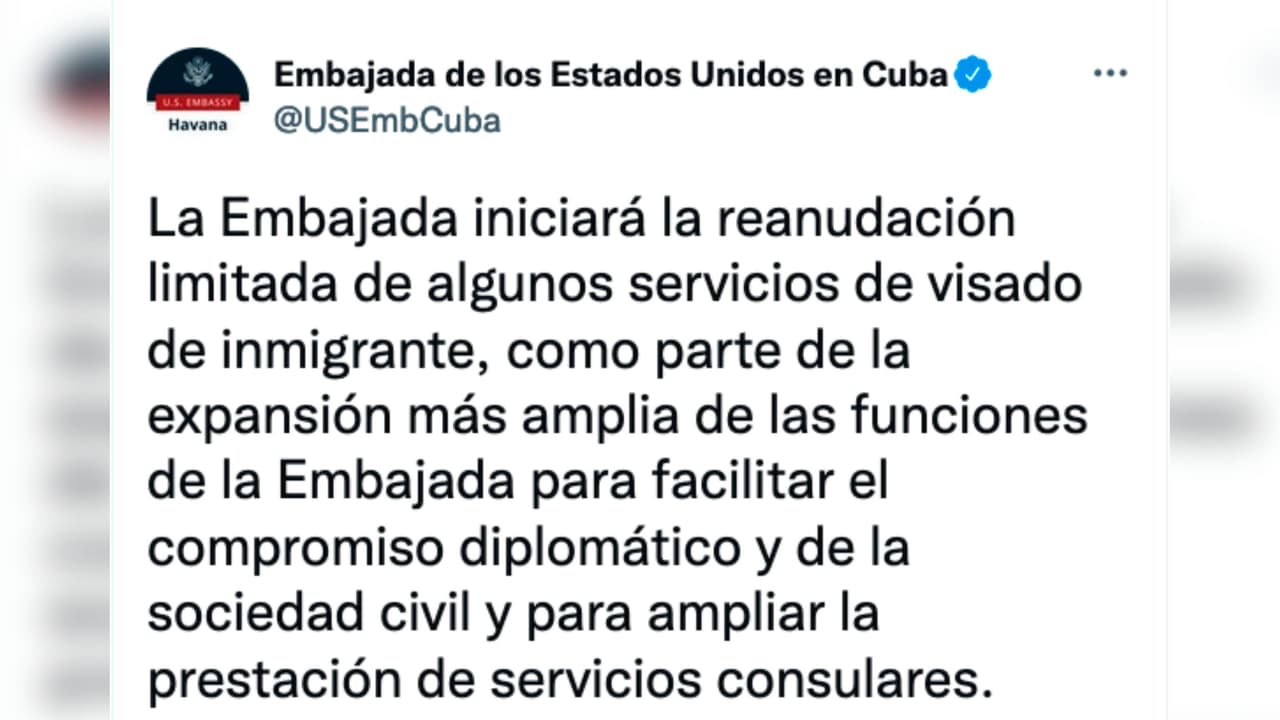 “La Embajada de los Estados Unidos en la Habana iniciará la reanudación limitada de algunos servicios de visado de inmigrante, como parte de la expansión más amplia de las funciones de la Embajada para el compromiso diplomático y de la sociedad civil y para ampliar la prestación de servicios consulares”, dice el comunicado.