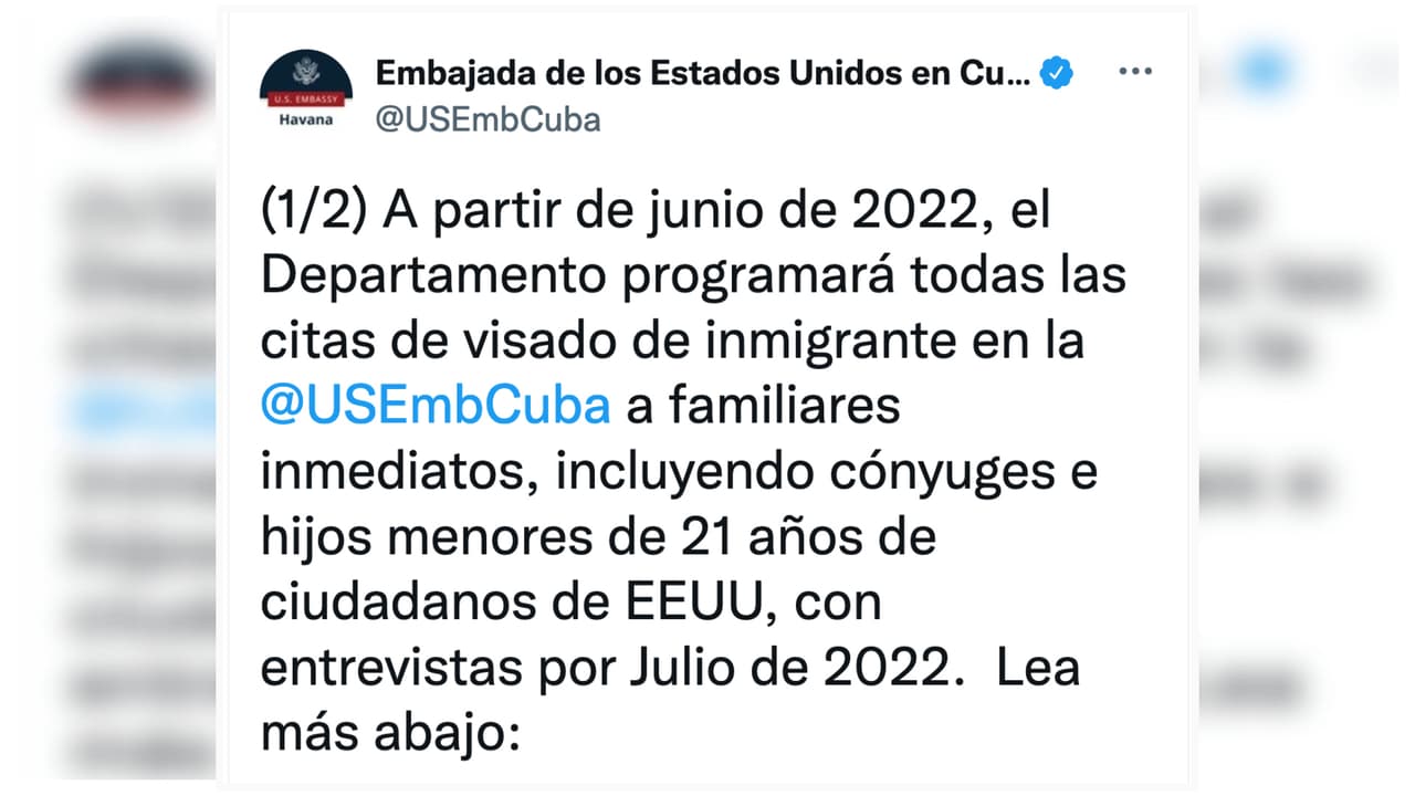"A partir de junio del 2022, el Departamento programará todas las citas de visado de inmigrante en la Embajada de Estados Unidos en La Habana, a familiares inmediatos, incluyendo cónyugues e hijos menores de 21 años, de ciudadanos estadounidenses, con entrevistas que comienzan en julio del 2022", dice la declaración.