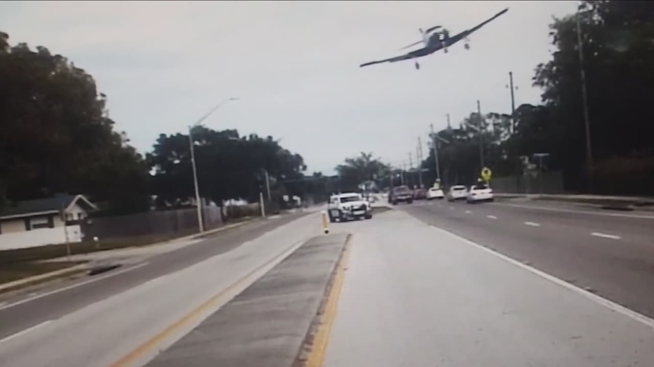 Las imágenes, captadas por la cámara de vigilancia de una patrulla, muestran el aterrizaje de emergencia de una avioneta en una autopista de la ciudad de Clearwater, en Florida. El piloto de la aeronave chocó contra un árbol, pero salió ileso.