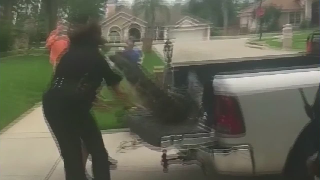 Uno de los oficiales que lo sostenía sobre una camioneta recibió el coletazo por parte del animal. Las imágenes fueron captadas en Ocoee, Florida.