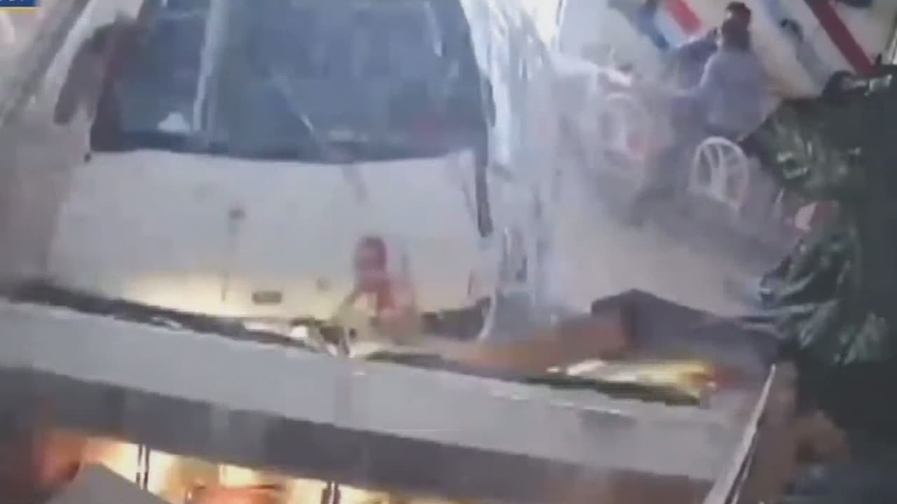 En video: Una van que transportaba estudiantes atravesó la puerta de un restaurante y quedó dentro del lugar