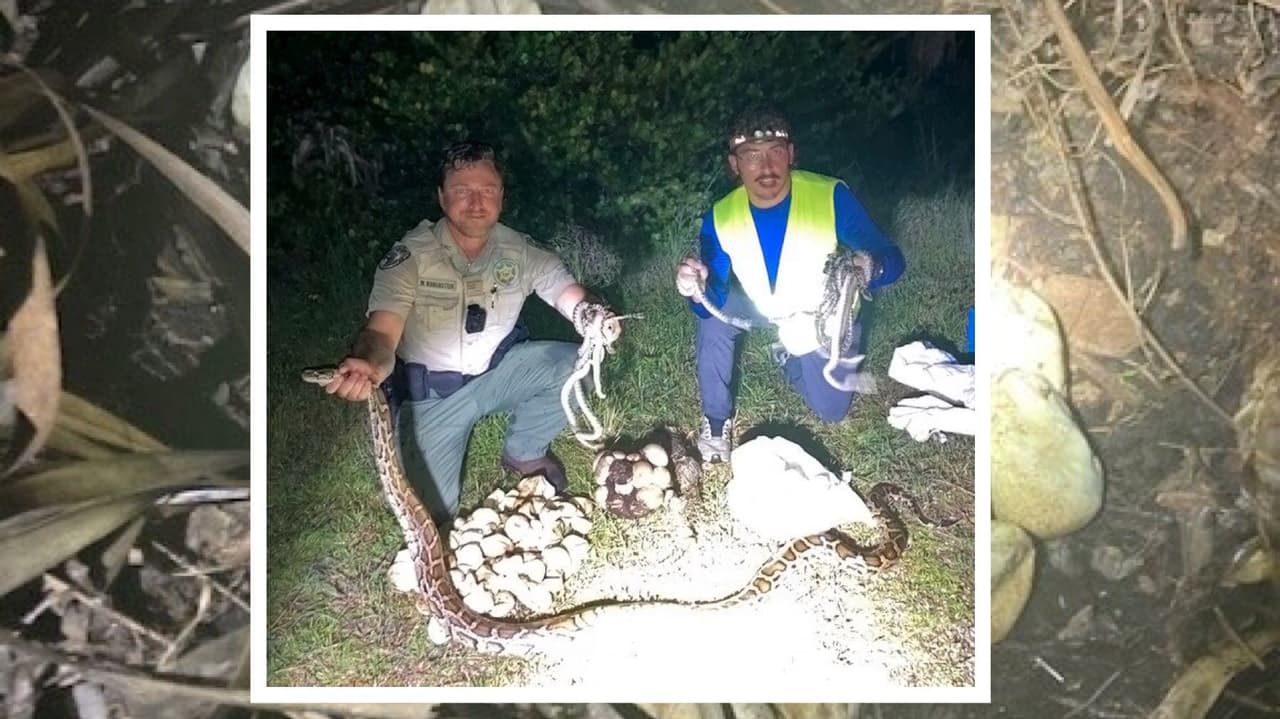 Un oficial de la comisión de vida silvestre y un contratista, estaban patrullando en una reserva del sur de Florida, cuando hallaron una pitón bebé. Pero su sorpresa fue mayor, cuando encontraron dos enormes pitones madres, una de ellas con 23 huevos y 18 crías.