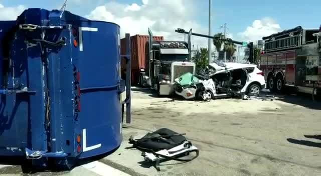 Video Un camión, una rastra y un auto protagonizan accidente vehicular cerca a la entrada de Port Everglades