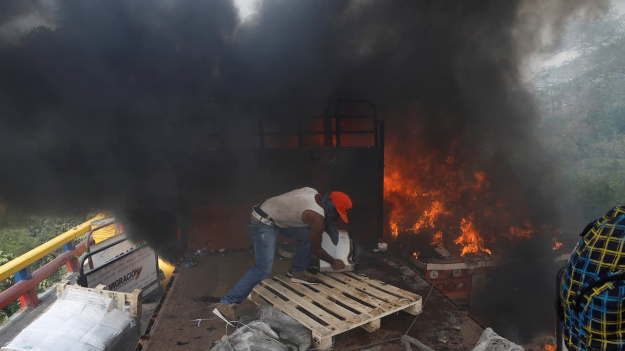 Entre las ruinas de los camiones incinerados, jóvenes venezolanos siguen tratando de ingresar la ayuda humanitaria