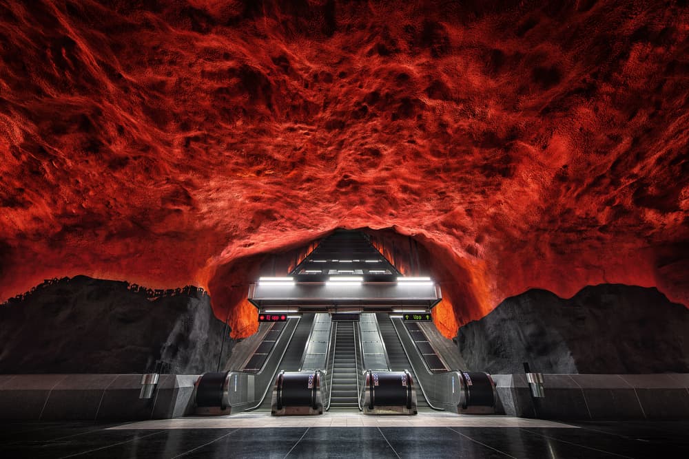 Se dice que el metro de Estocolmo es la galería de arte más grande del mundo y esta sección es la prueba de ello, ya que la primera atracción son los trabajos de los artistas Anders Aberg y Karl-Olov Bjork quienes pintaron la superficie rocosa de un rojo intenso. Cualquiera que baje por las escaleras hacia los andenes sentirá que está a punto de entrar en un mundo místico y fascinante.