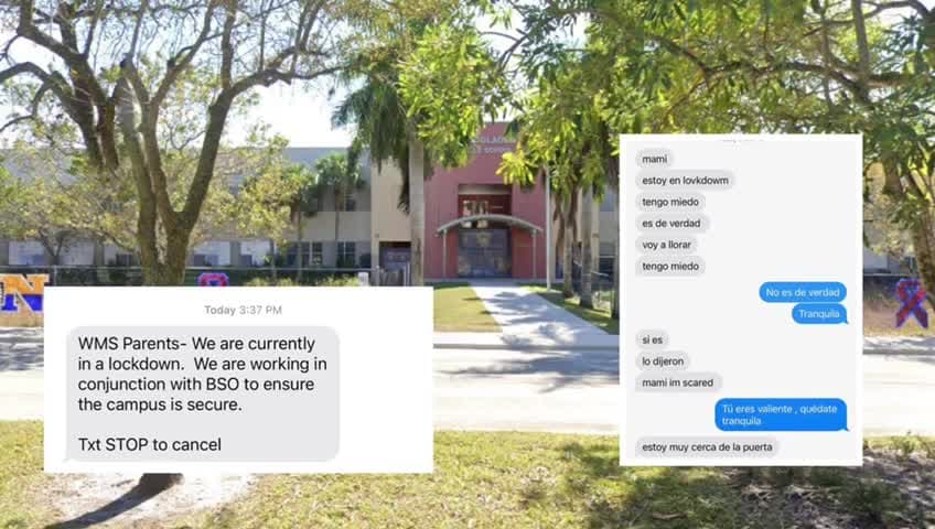 A las 3:37 pm estudiantes de la escuela Westglades Middleschool, en Parkland, enviaron mensajes a sus padres, con miedo porque estaban en cierre preventivo. Después de las 4:00 pm autoridades reabrieron la escuela, pero mantienen cerradas algunas calles alrededor.