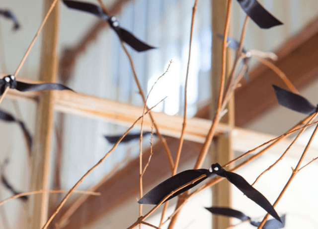 Si tienes en casa de esas plantas artificiales con ramas, puedes llenarla de pequeños murciélagos. Tan solo necesitas atar un lazo de color negro y dibujarle ojos.