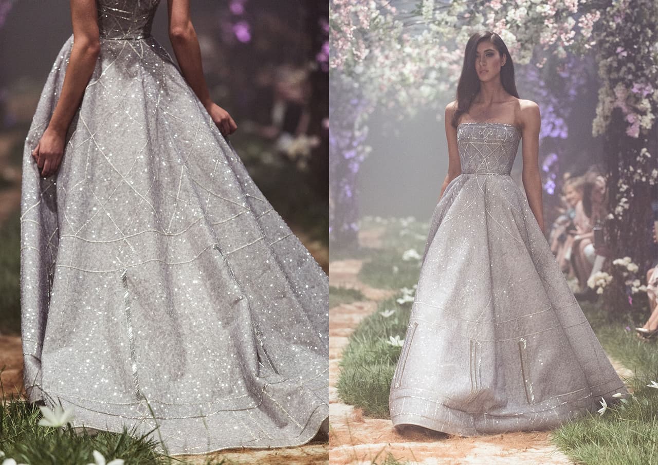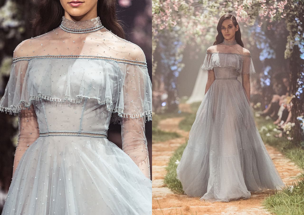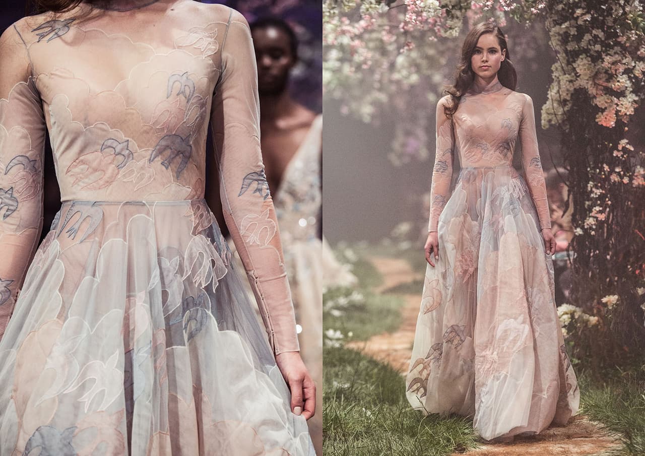 Inspirado en la escena final de La Bella Durmiente, cuando baila sobre las nubes con el príncipe Felipe. El vestido está bordado simulando la técnica que usaron con la cámara multiplano, desarrollada para Blancanieves. Con ella las obras de animación se pintaban capa por capa para darle profundidad y movimiento.
