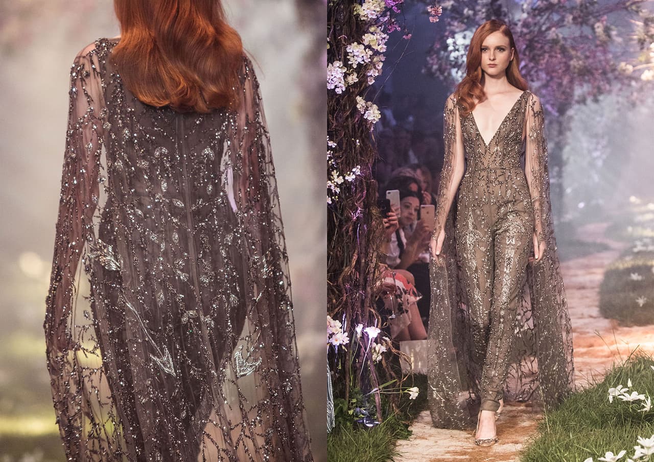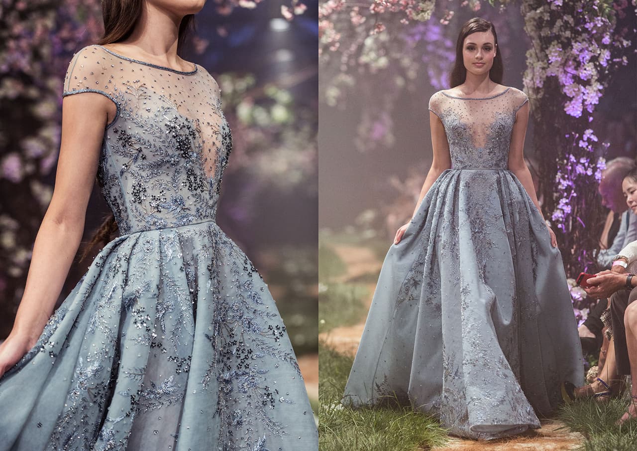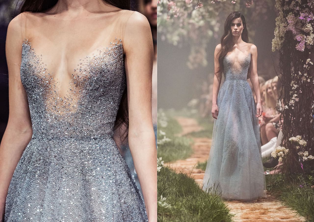 Inspirado en la escena final de La Bella Durmiente, cuando baila sobre las nubes con el príncipe Felipe. El vestido está bordado simulando la técnica que usaron con la cámara multiplano, desarrollada para Blancanieves. Con ella las obras de animación se pintaban capa por capa para darle profundidad y movimiento.