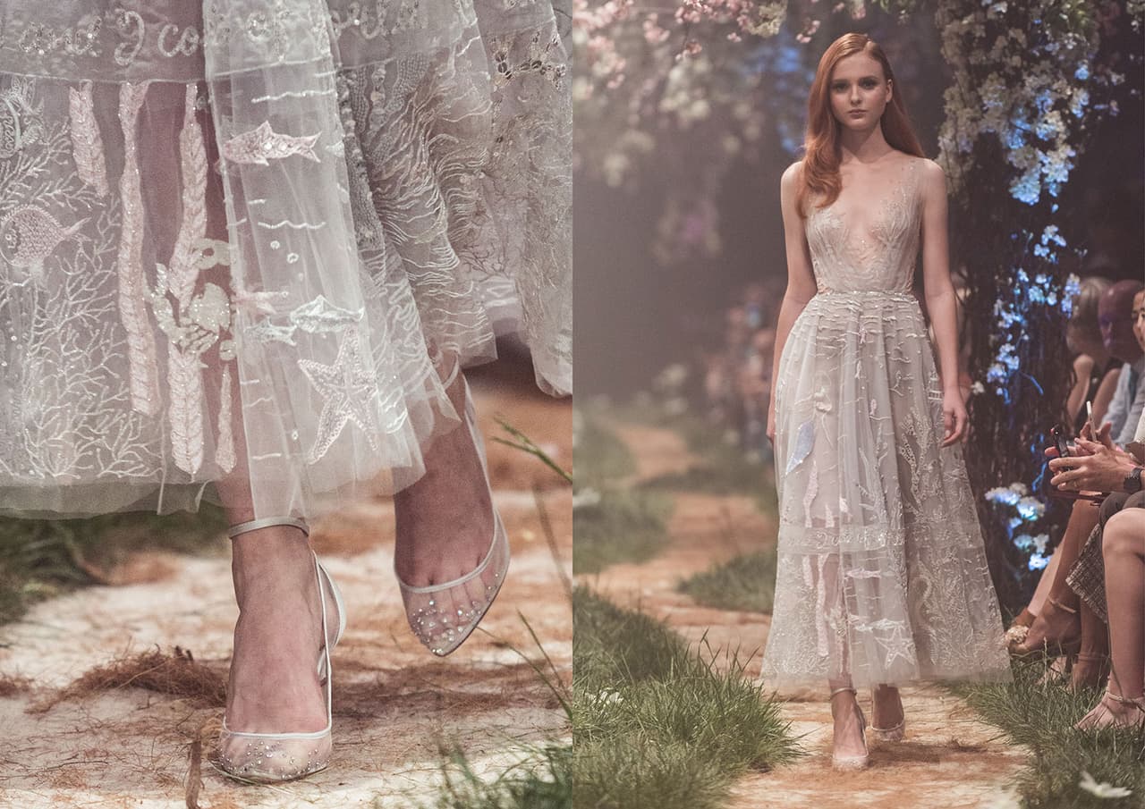 Inspirado en la transformación de Ariel cuando se convierte en humana, este vestido presenta tiene pequeños cristales que dan la ilusión de un escote.