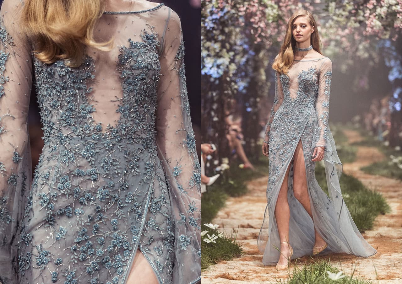 Este vestido está inspirado en el icónico "¡Hazlo rosa! ¡Hazlo azul!", la escena de La Bella Durmiente. Está adornado con cuentas y bordados florales