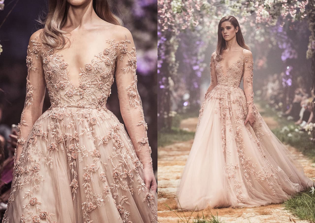 Está inspirado en el vestido rosa de la princesa Aurora en La Bella Durmiente. Esta pieza tiene 120 metros de tul italiano y está adornada con bordados tridimensionales de rosas y espinas.