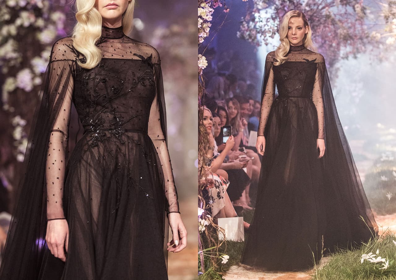Este modelo está inspirado por la Reina Malvada de Blancanieves. El vestido está adornado con estrellas negras meticulosamente bordadas a mano.