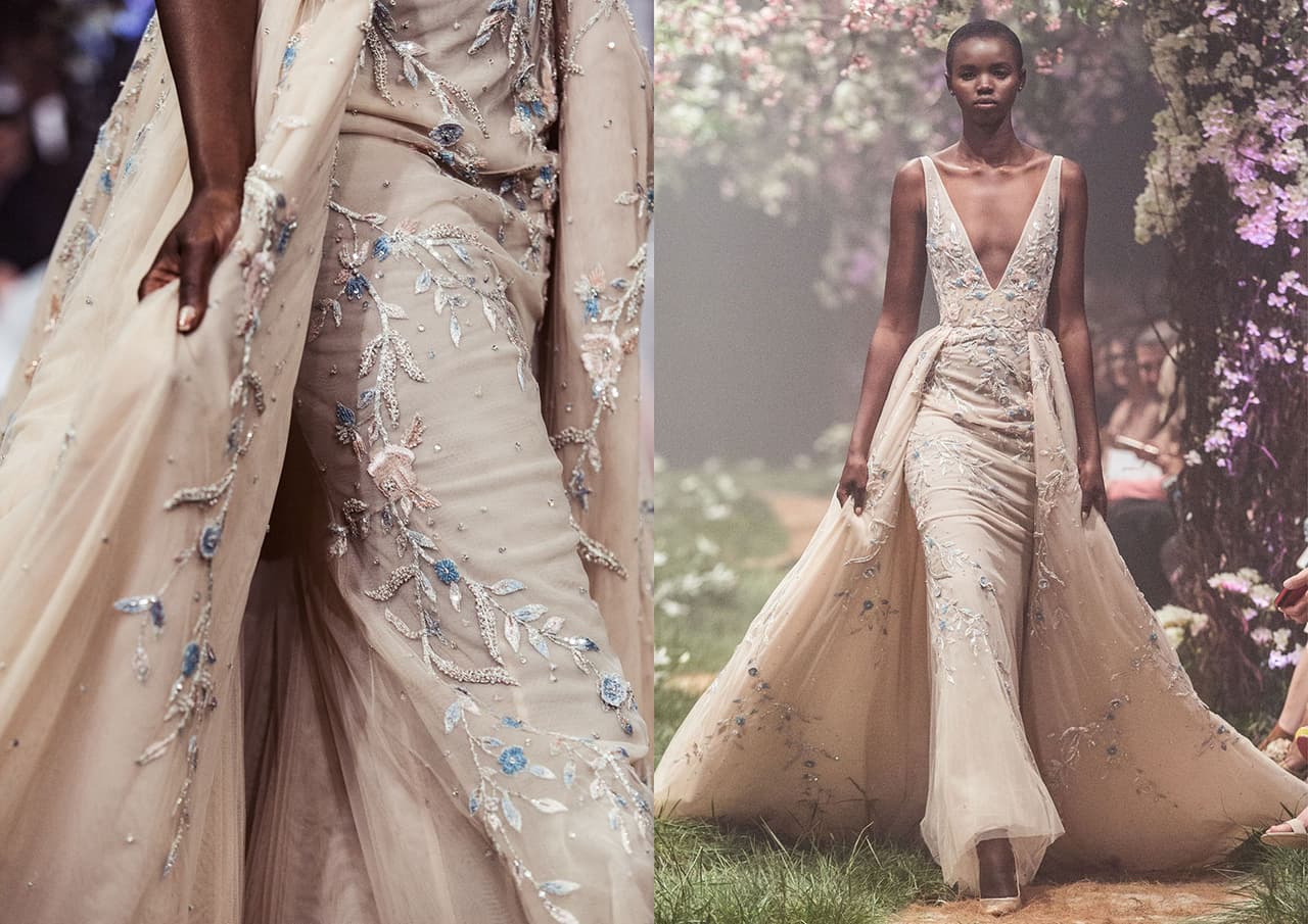 Este bellísimo vestido con corte de sirena está repleto de flores y ramas bordadas a mano.