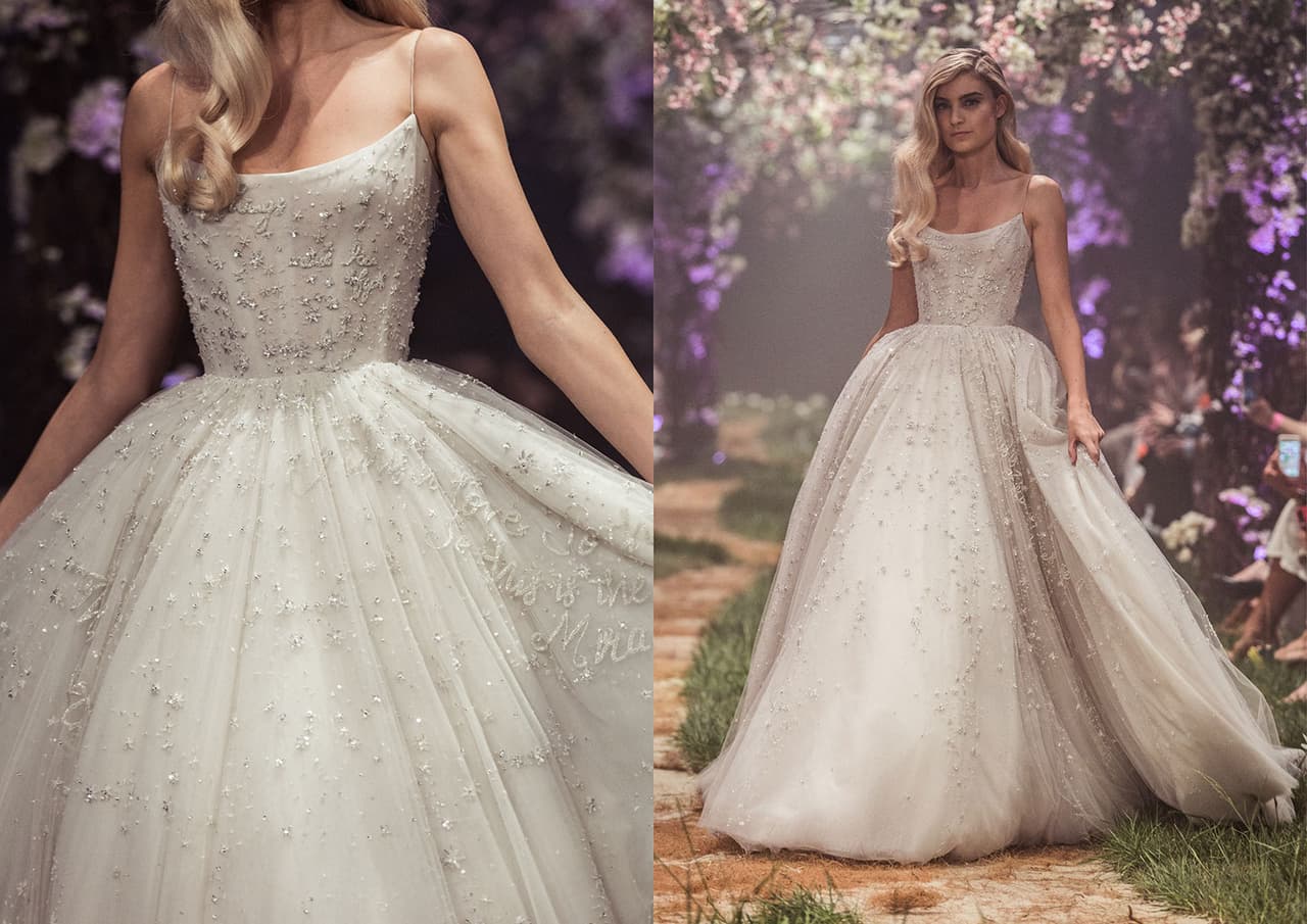 Este divino vestido de baile de tul fue inspirado en la canción de Cenicienta, 'Esto es Amor', la que baila junto al príncipe antes de media noche. Está adornado con perlas de hadas y con la letra de la canción.