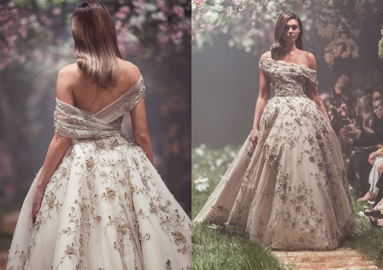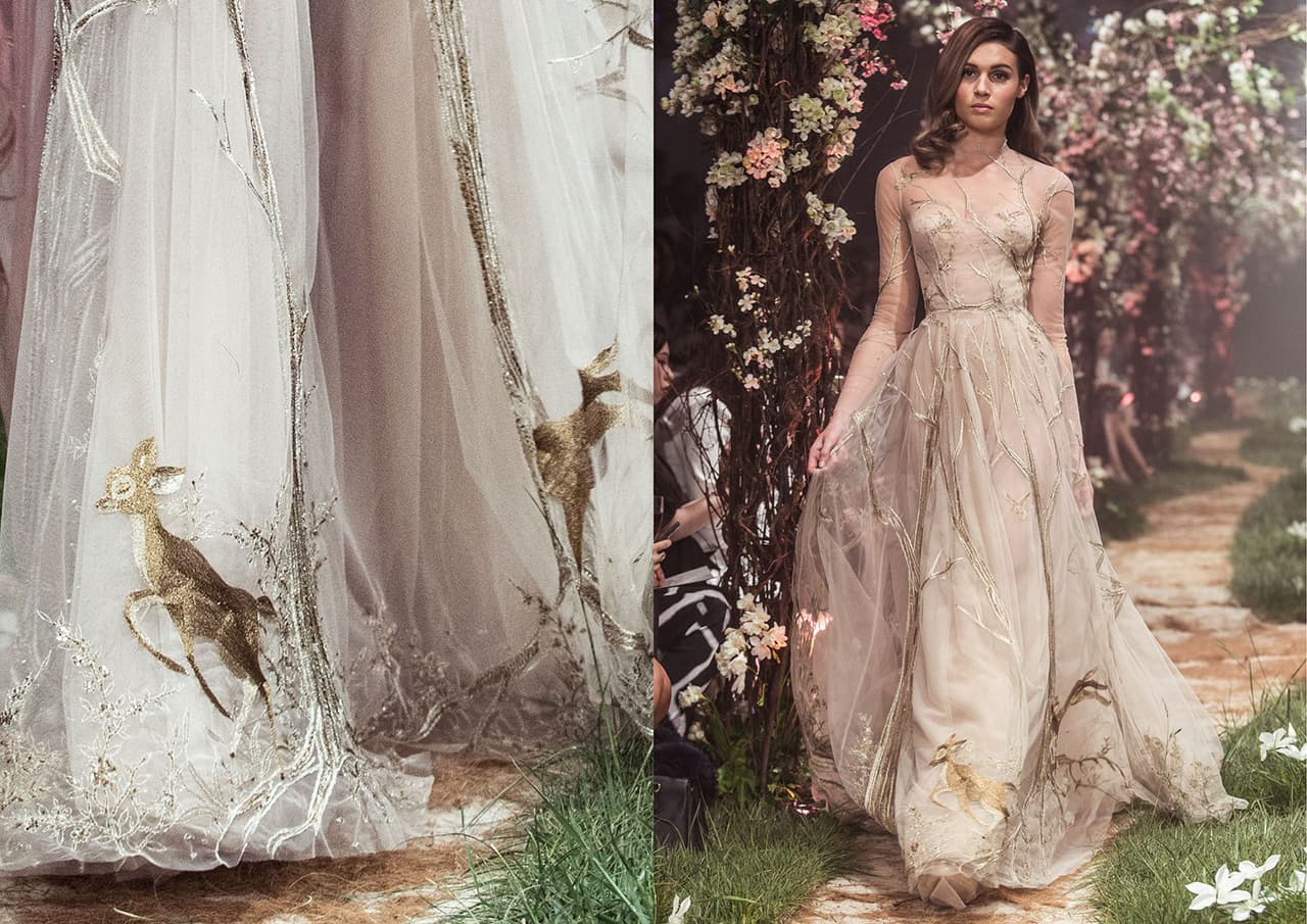 Inspirado en la manzana envenenada que envía a Blancanieves a la muerte, este vestido con bordados de manzana y ramas silvestres en capas de tul francés es sencillamente hermoso.