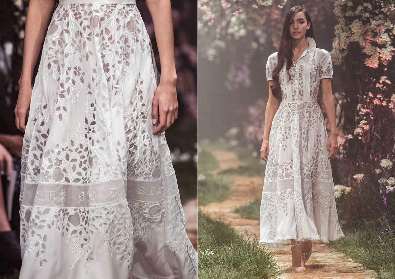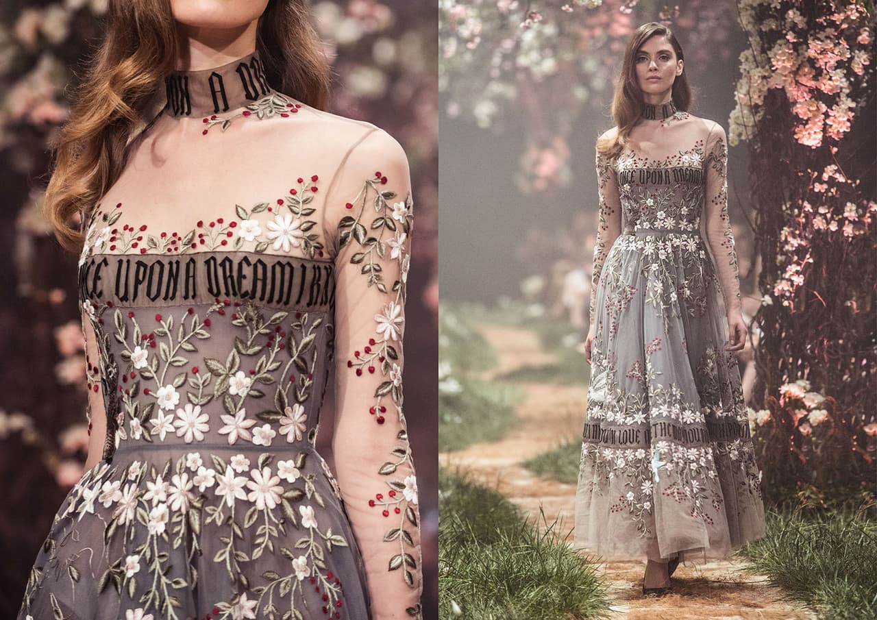 Inspirado en una de las escenas de Alicia en el país de las maravillas, esta pieza tiene bordados narcisos, lirios y dientes de león.