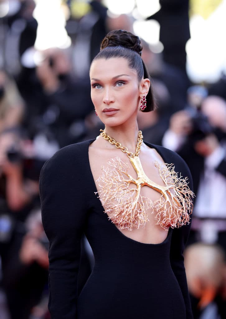 La modelo deslumbró en el Festival de Cannes de 2021 con un vestido negro ajustado confeccionado con un profundo escote hasta debajo del busto que le permitió lucir un extraordinario collar en forma de pulmones.