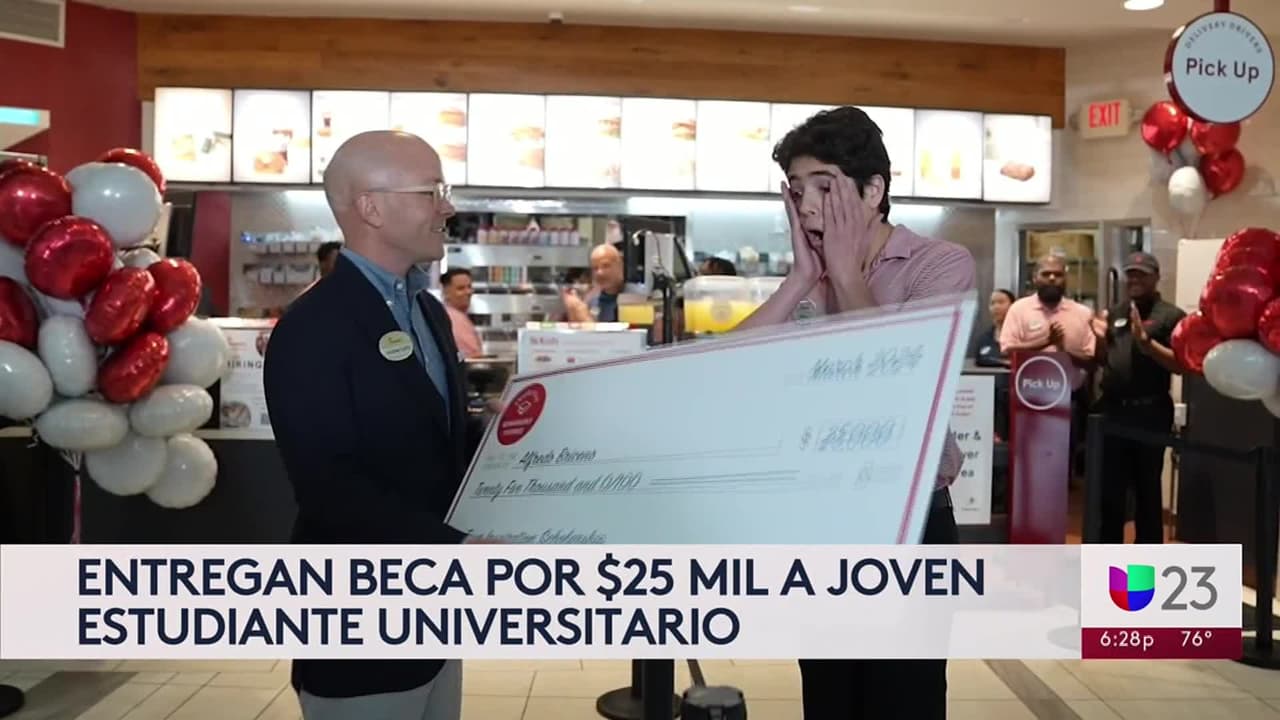 El estudiante universitario Alfredo Briceño recibió una gran sorpresa en el Chick-fil-A del centro comercial Dadeland donde trabaja. Le entregaron una beca de 25,000 dólares para continuar su educación y crecimiento personal más allá del restaurante.