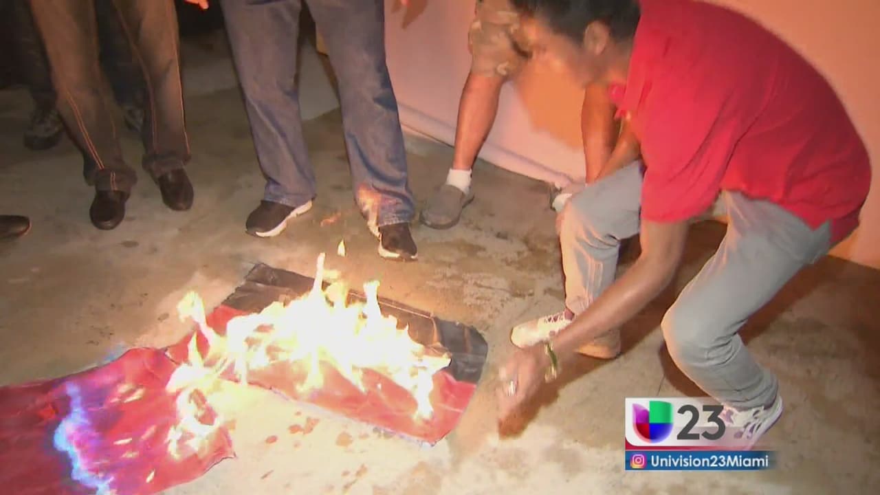 De manera simbólica, exiliados cubanos quemaron banderas castristas para expresar su molestia con el régimen político en Cuba.