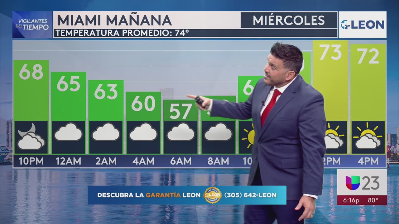 La temperatura máxima en el sur de la Florida durante el miércoles fue de 85 grados, pero la llegada de un frente frío hará que las sensaciones durante el amanecer del jueves sean de 55 grados.