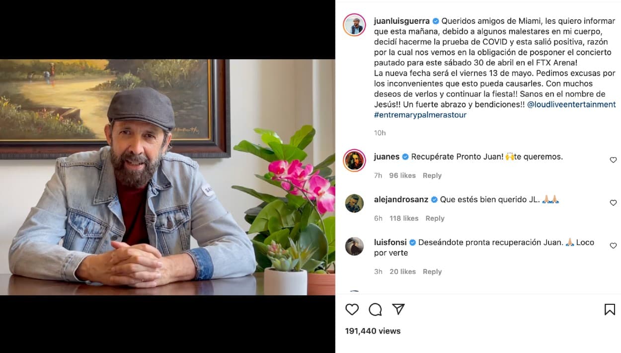 "Queridos amigos de Miami, este video es para informarles que esta mañana por malestares del cuerpo, decidí hacerme una prueba del covid y salió positiva, razón por la cual nos vemos en la obligación de posponer nuestro concierto que teníamos para este 30 de abril en el FTX Arena", informó Guerra a través de un video que colgó en Instagram.