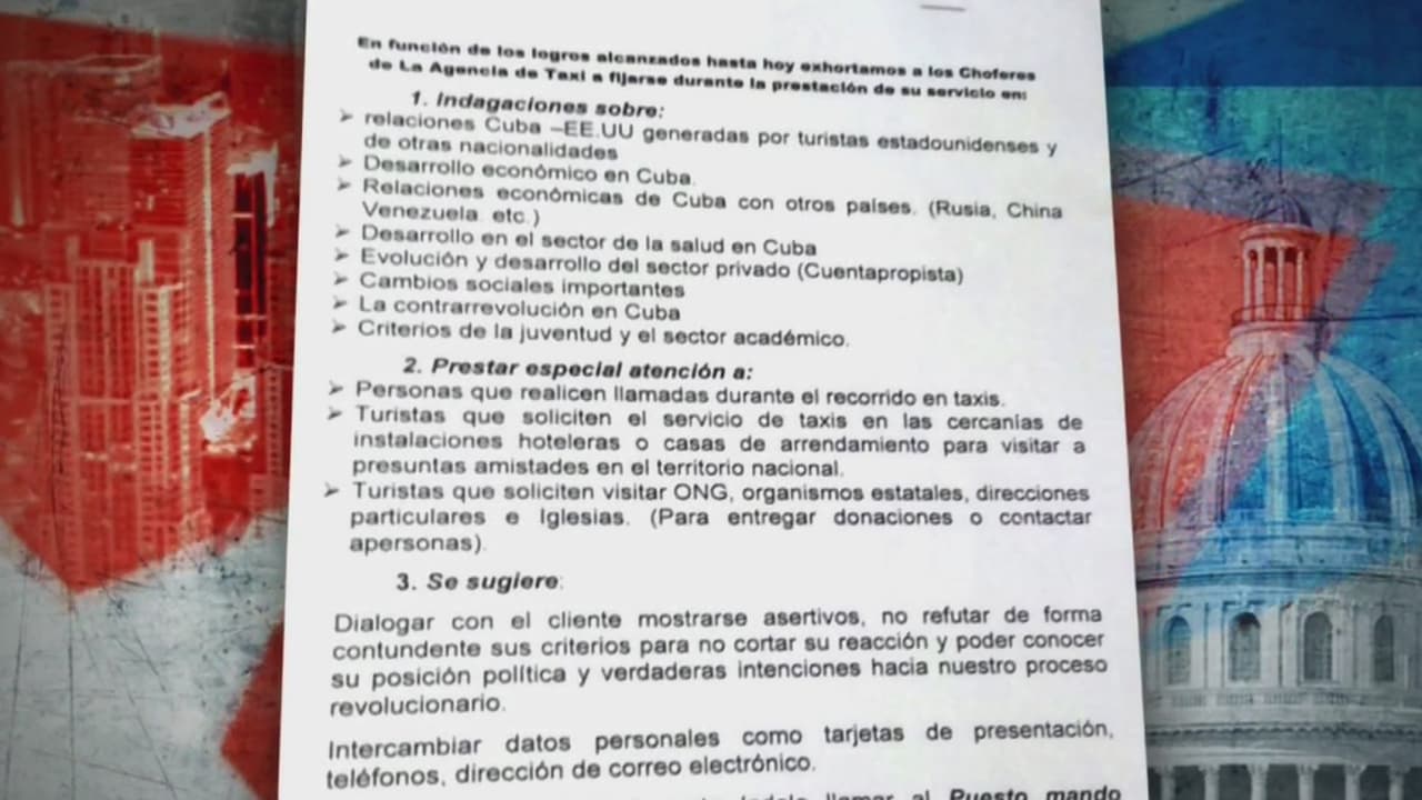 Noticias 23 tuvo acceso al documento donde se le pide a los choferes de taxis para turismo que estén atentos a las conversaciones de sus clientes. Opositores dentro de la isla están denunciando la iniciativa como una estrategia que pondría en peligro a todo aquel que visite Cuba.