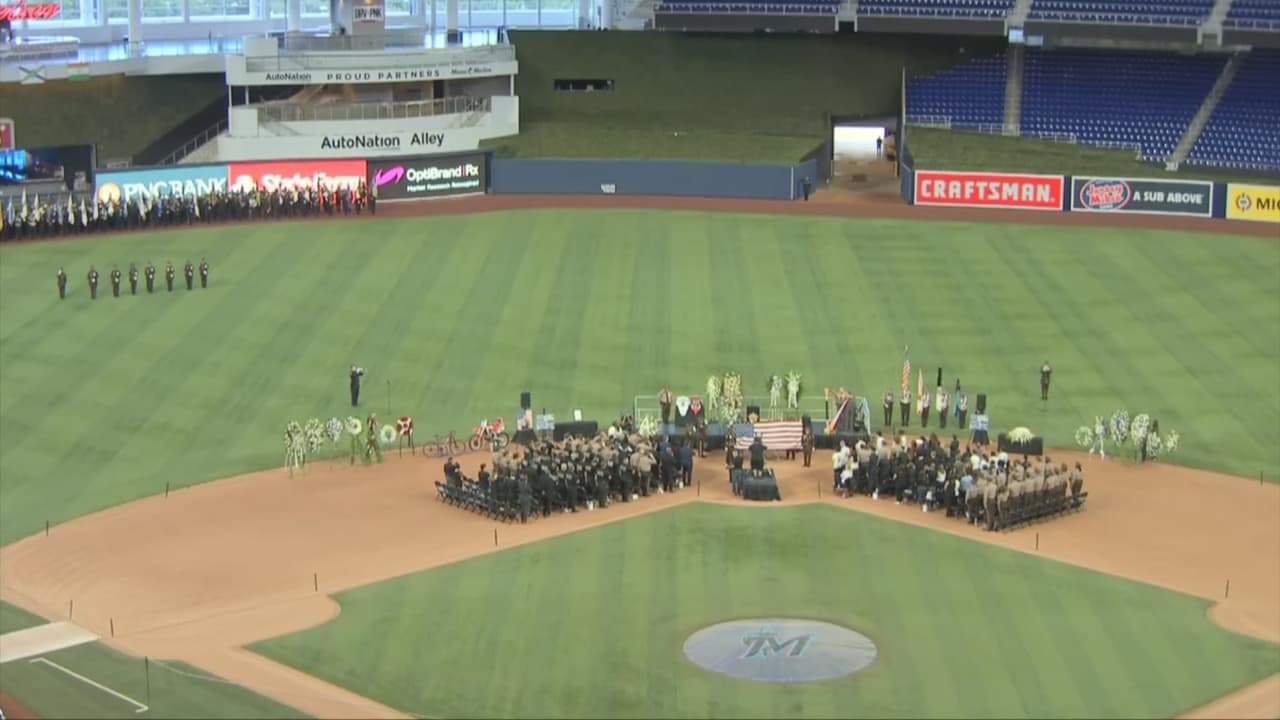 Los agentes de la policía de Miami-Dade, departamento al que pertenecía Echaverry, realizaron una procesión hasta el estadio de los Marlins este miércoles, en donde se realiza la ceremonia, junto a la familia y allegados del oficial fallecido.