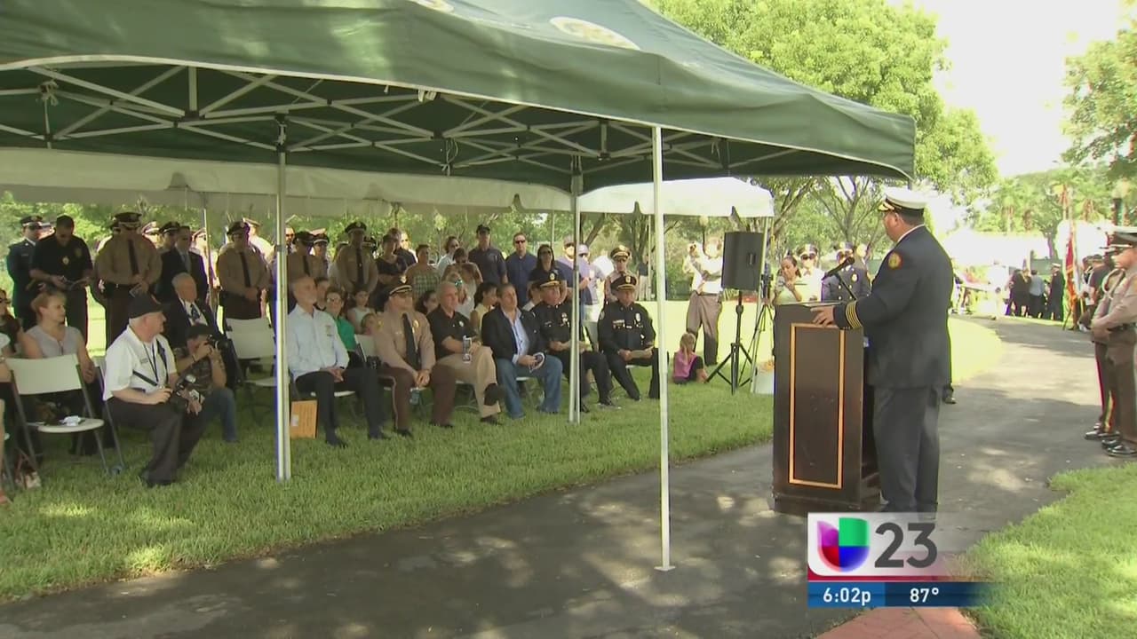 La patrulla del oficial de Miami-Dade Devin Jaramillo forma parte de un altar para rendirle homenaje