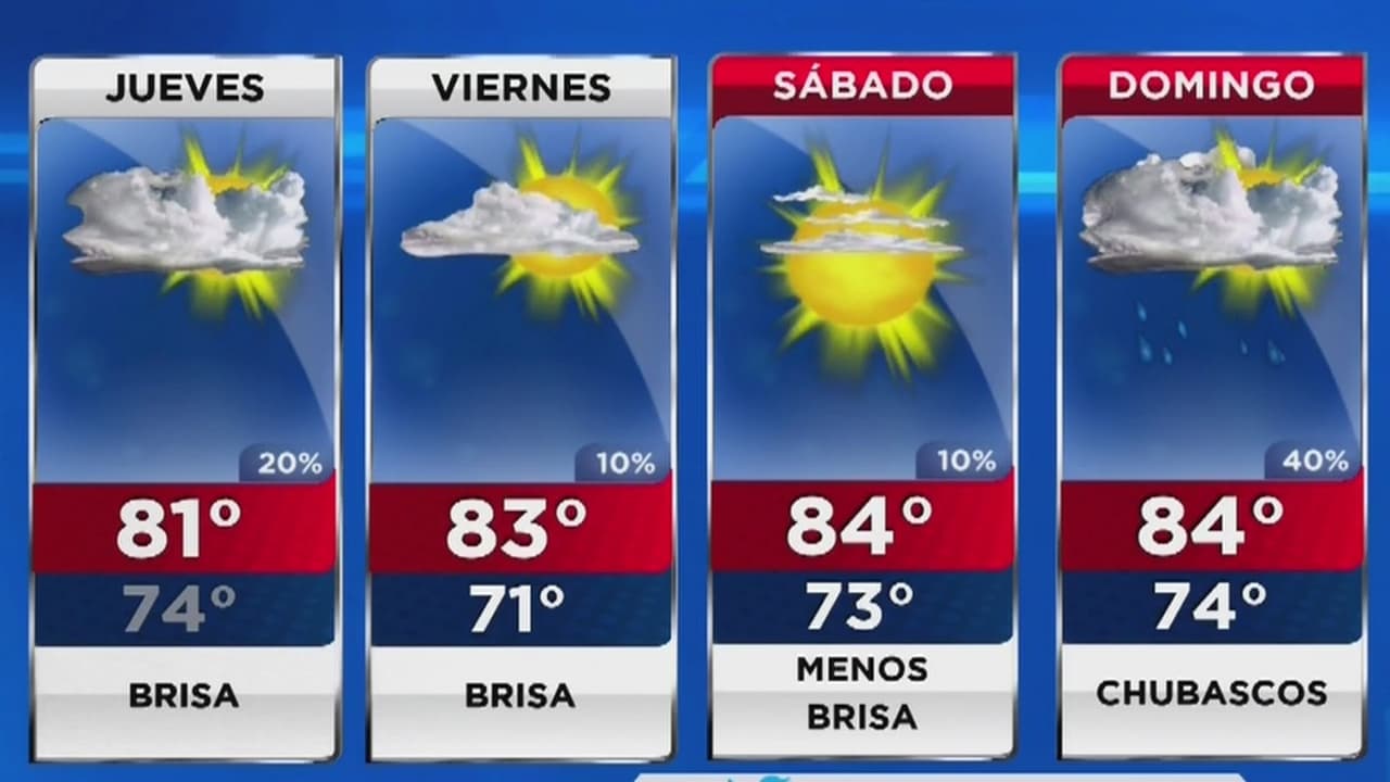 Las autoridades mantienen la alerta por las corrientes de resaca. La temperatura máxima llegará a 81 grados, y la mínima de 74 grados. Hay un 20 % de probabilidades de lluvia, especialmente en horas de la tarde.
