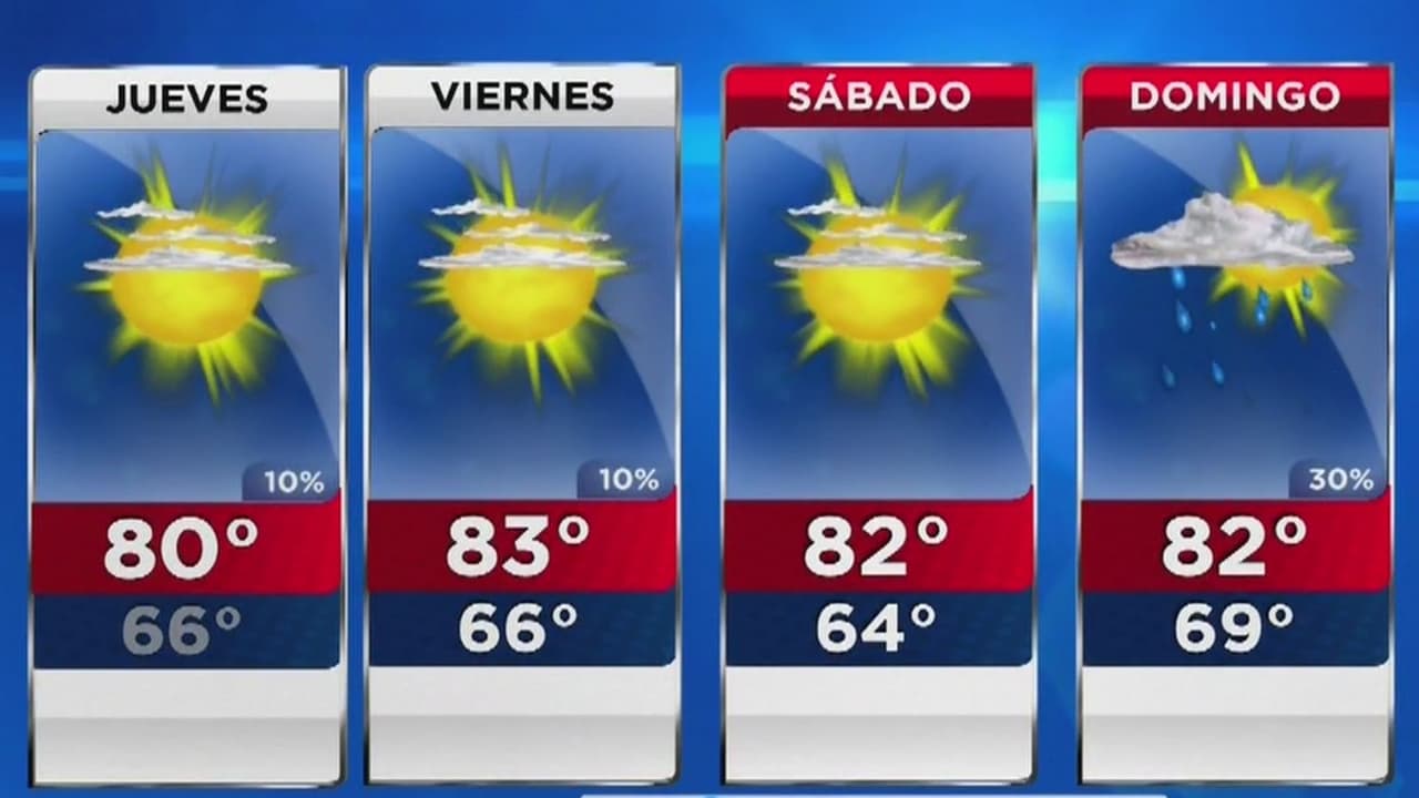 Este jueves hay pocas probabilidades de lluvia, a pesar de que se acerca un sistema al sur de Florida. La máxima temperatura del día será de 80 grados, y la mínima de 66 grados, sin que varíe mucho en los próximos días.