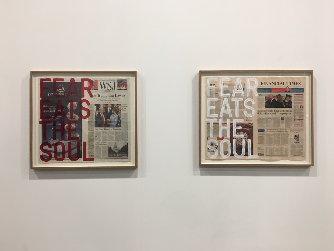 Expuesta sobre las paredes de la galería mexicana Karimazutto, se pueden ver varias portadas de diarios en inglés y en español el día en el que el presidente Trump tomó posesión. Los artículos son interrumpidos por unas enormes frases que sentencian: ‘Fear eats the soul’ (‘El miedo devora el alma’) .