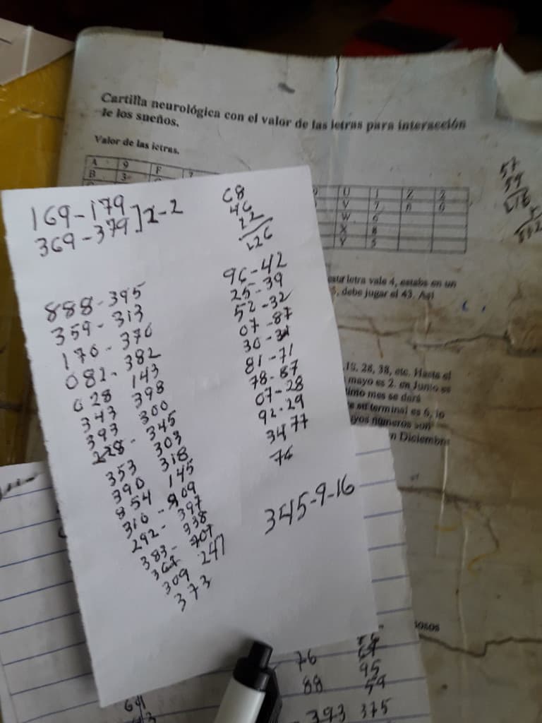 “Hay personas que no vienen, yo paso por sus casas y les recojo los números y el dinero porque me queda de camino a casa del banquero. Entrego una lista de todos los que jugaron pero me quedo con un doble para después comprobar quienes fueron los ganadores porque de los banqueros también tengo que cuidarme”, me dice Yasmany debajo de un poste de luz, con las palmas de sus manos repletas de escrituras con cuentas matemáticas en tinta azul.