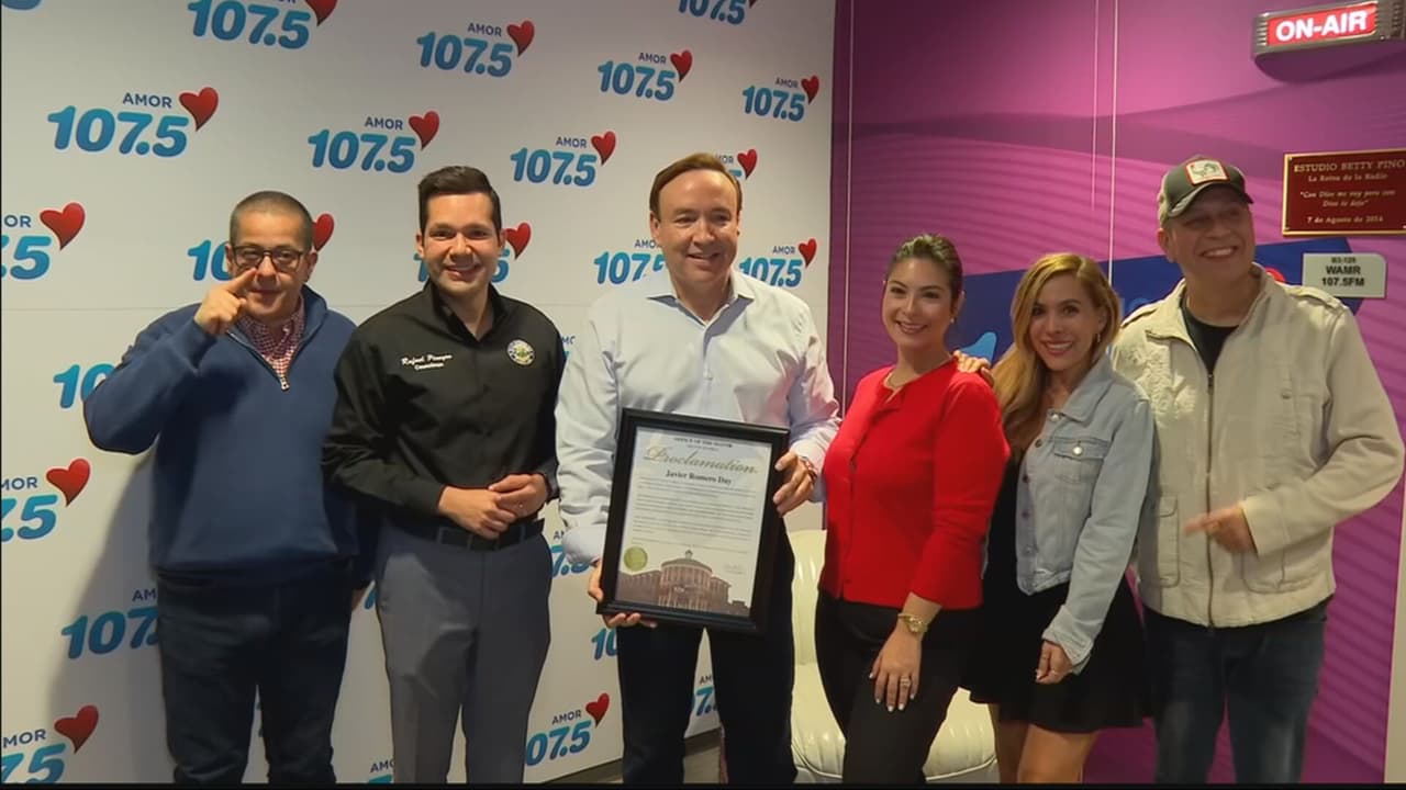 La alcaldesa de Doral y el concejal Rafael Pineyro entregaron a Javier Romero una proclama por su trayectoria profesional y los valores que representa en la comunidad hispana. El reconocimiento se hizo en el Día Mundial de la Radio.